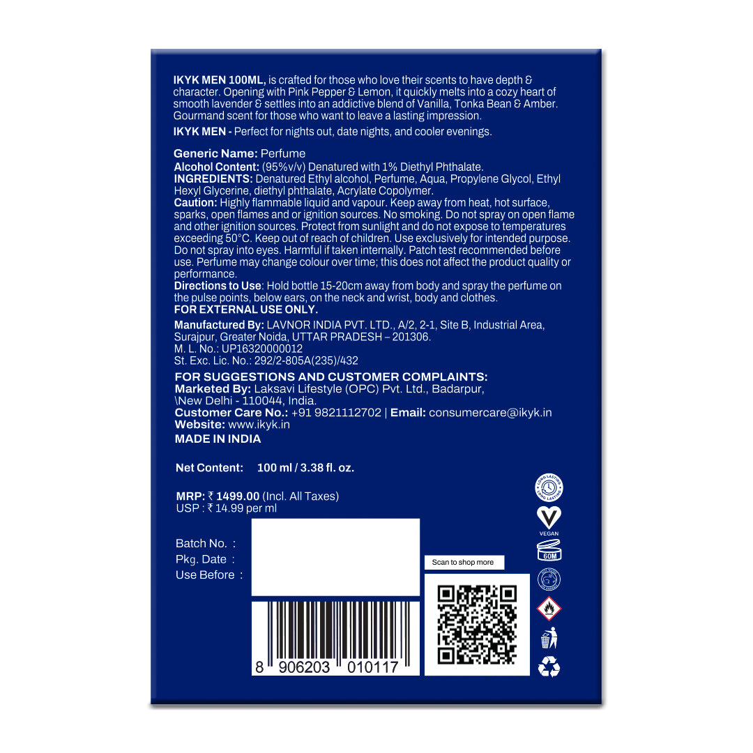 IKYK MEN 100ml, is crafted for those who love their scents to have depth & character. Opening with Pink Pepper & Lemon, it quickly melts into a cozy heart of smooth lavender & settles into an addictive blend of Vanilla, Tonka Bean & Amber. Gourmand scent for those who want to leave a lasting impression.