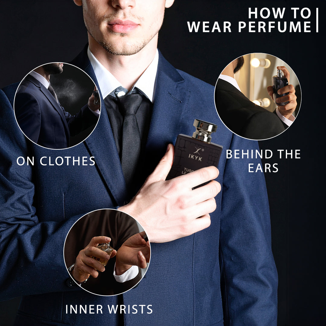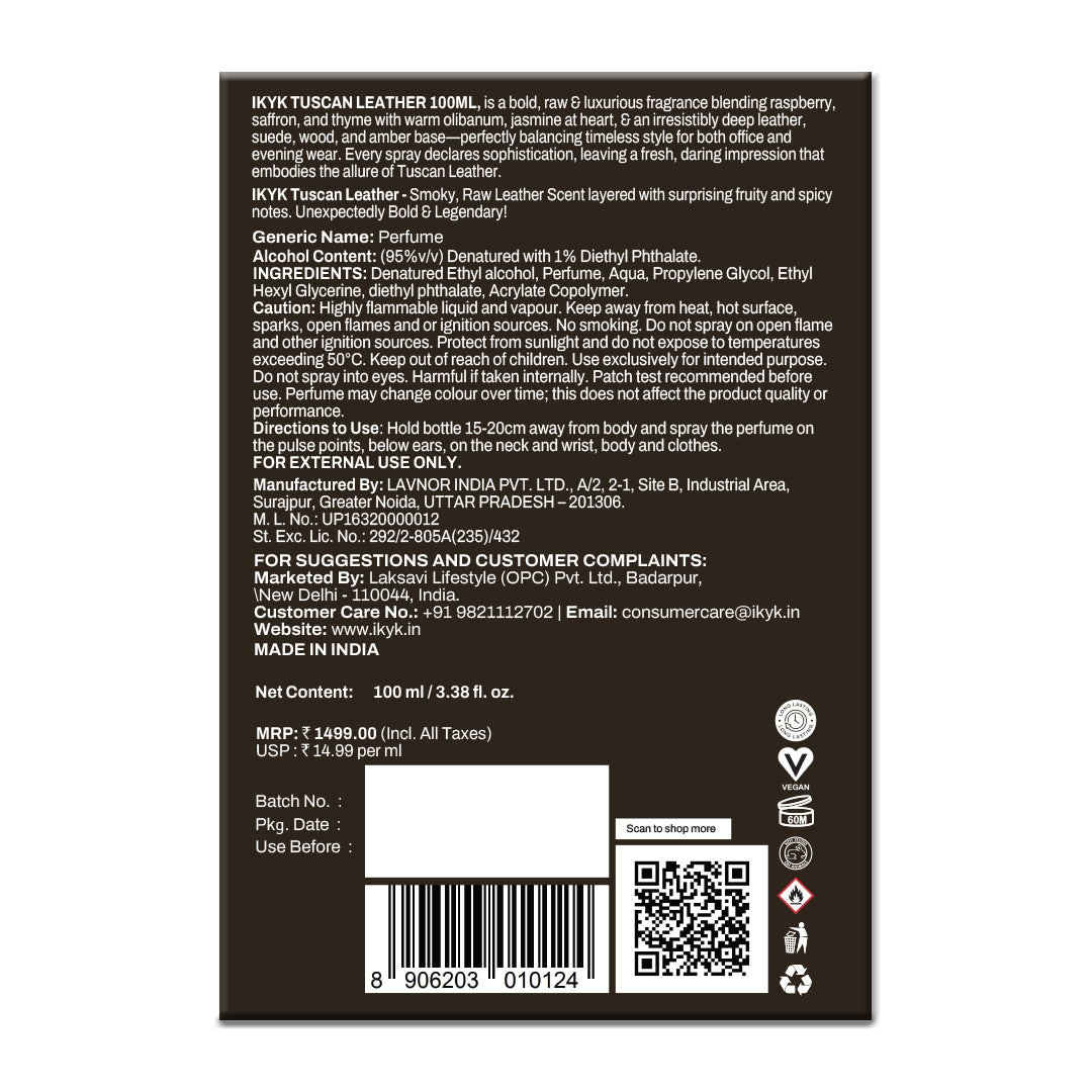 IKYK Tuscan Leather – Smoky, Raw Leather Scent layered with surprising fruity and spicy notes. Unexpectedly Bold & Legendary!Marketed By –Laksavi Lifestyle (OPC) Pvt. Ltd. New Delhi – 110044